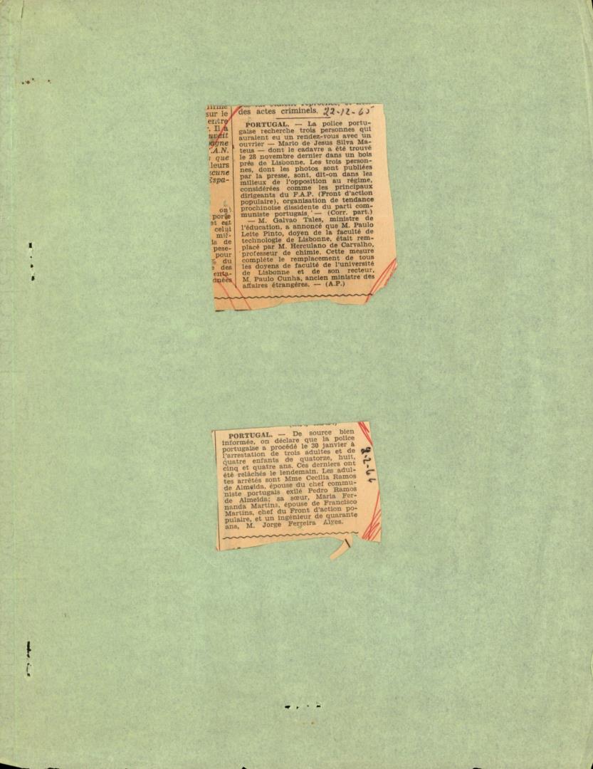 Artigo de jornal não identificado sobre a prisão pela PIDE em finais de janeiro de 1966, de Francisco Martins Rodrigues, ex-membro executivo do Partido Comunista e membro da Frente de Acção Popular e da sua mulher, Fernanda Martins Rodrigues, quatro filhos e familiar Cecília Ramos.