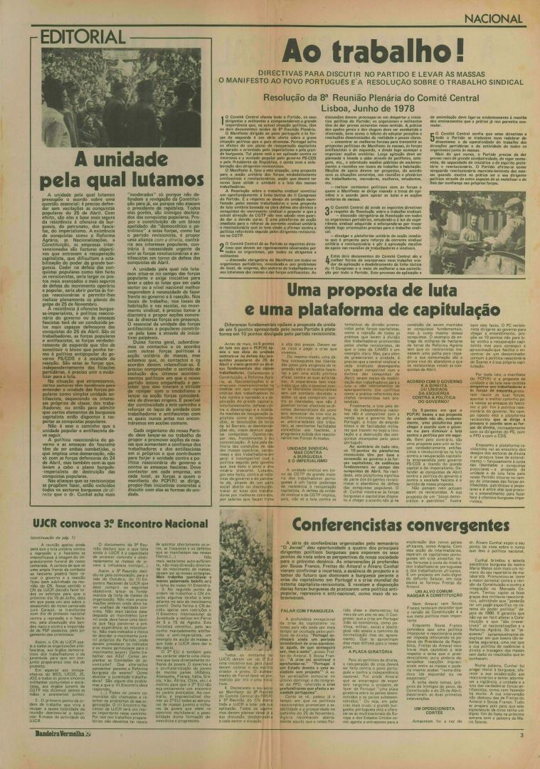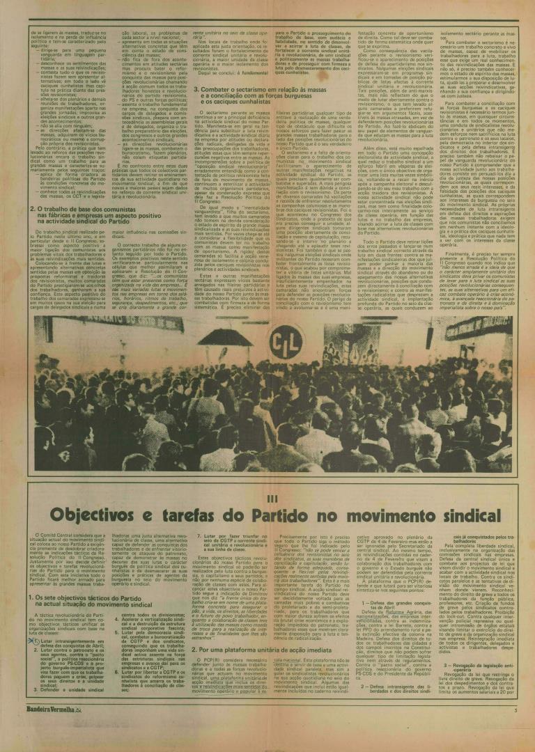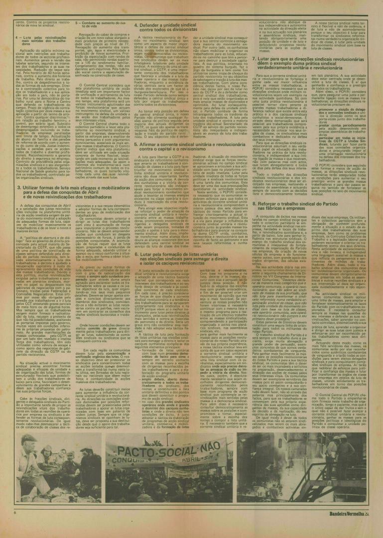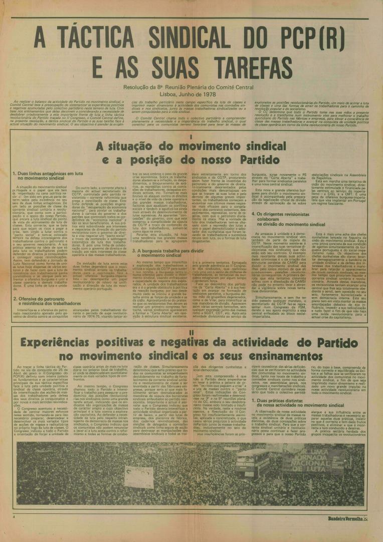 Artigo publicado no jornal "Bandeira Vermelha", intitulado: "A Táctica Sindical do PCP(R) e as suas Tarefas: Resolução da 8ª Reunião Plenária do Comité Central", pp. 4-6.