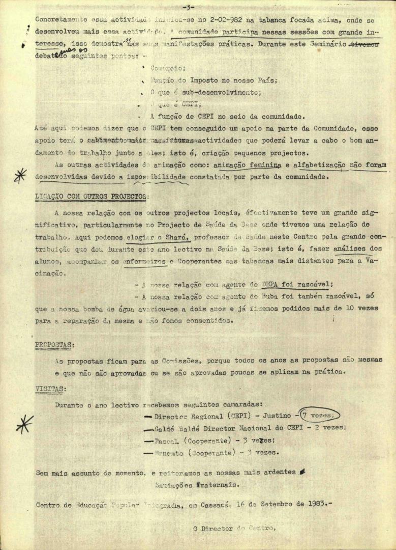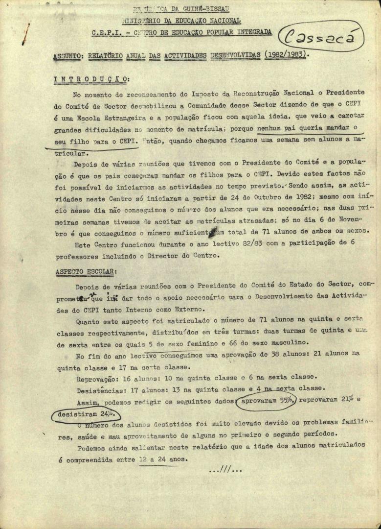 República da Guiné-Bissau. Ministério da Educação Nacional. CEPI - Centro de Educação Popular Integrada - Cassacá. Relatório anual das Actividades Desenvolvidas (1982/1983)