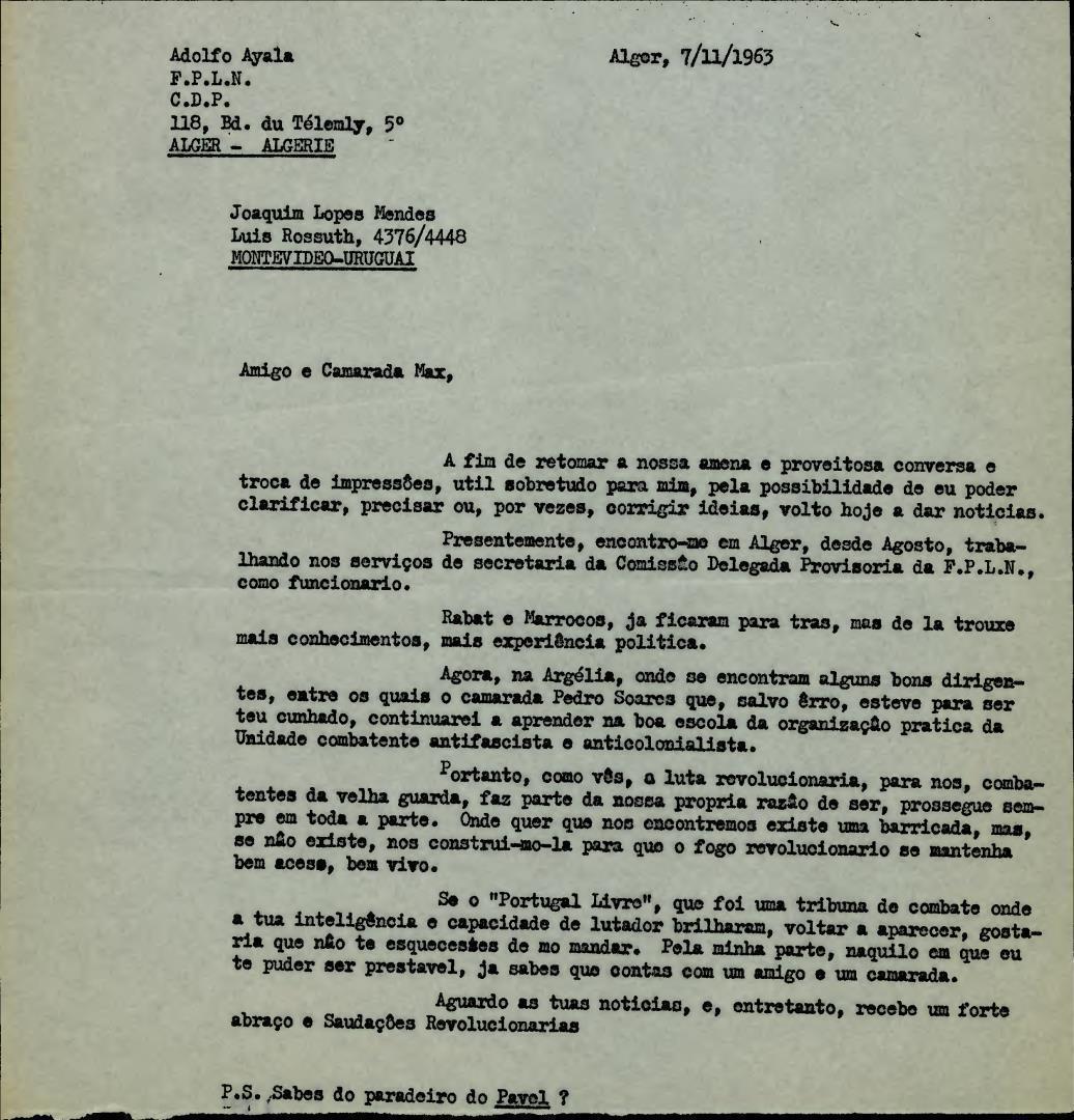 Carta datilografada remetida por Adolfo Ayala, em Alger, a Joaquim Lopes Mendes, em Montevideo, dando-lhe conta da sua estadia em Alger e da situação da oposição ao regime político em Portugal.