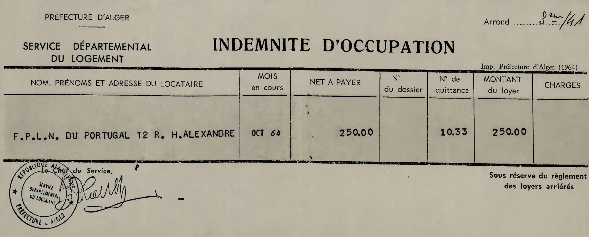 Documento da Prefeitura de Alger com referência a quantida monetária a pagar à Frente Portuguesa de Libertação Nacional.