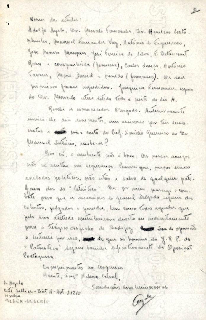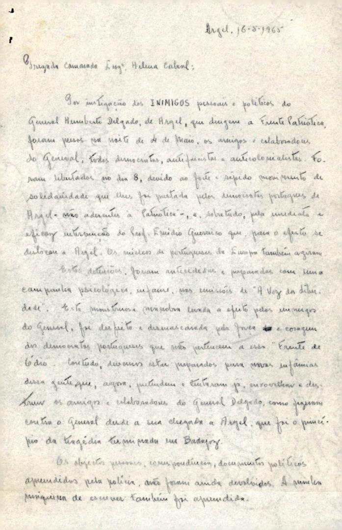 Carta manuscrita remetida, a partir de Argel, por Adolfo Ayala a Helena Cabral, na qual lhe transmite a notícia da prisão, na noite de 4 de maio, dos amigos e colaboradores do General Humberto Delgado. Foram libertados a 8 de maio, devido à intervenção de diversas pessoas, entre as quais destaca o Professor Emídio Guerreiro. Afirma que as detenções foram preparadas "com uma campanha psicológica, infame, nas emissões de «A Voz da Liberdade», advertindo Helena para o facto de poderem vir a surgir outros acontecimentos daquele tipo. Informa-a que os objetos apreendidos pela polícia ainda não foram devolvidos e deixa-lhe uma relação dos nomes dos detidos: Adolfo Ayala, Dr. Marcelo Fernandes, Dr. Amilcar Castanhinha, Manuel Fernandes Vaz, António de Figueiredo, José Moura Marques, José Ferreira da Silva, F. Bettencourt Rosa e companheira, Carlos Lança, António Tavares, Mme. David e marido, Joaquina Fernandes. Ayala faz a descrição do ambiente vivido em Argel, e afirma que prosseguirá "o combate para que os assassinos do general Delgado sejam descobertos, julgados e punidos".