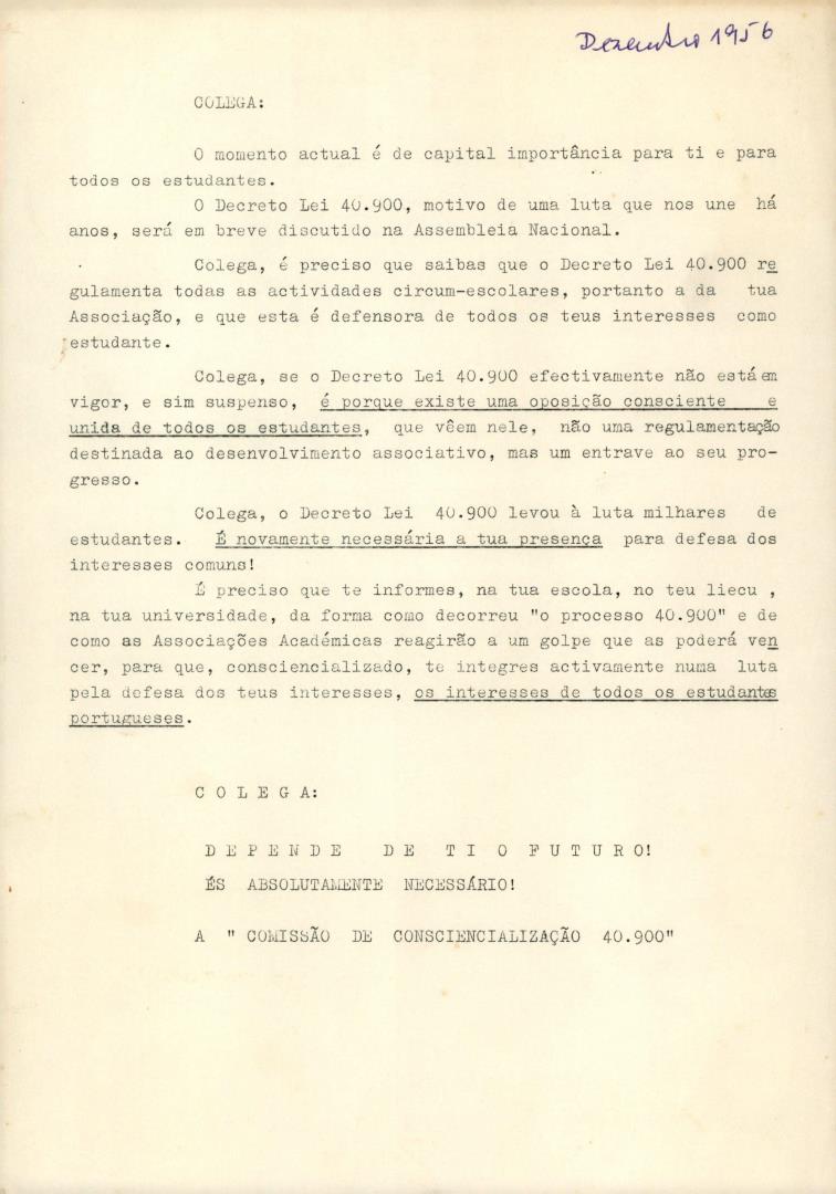 Conteúdo e Estrutura | Âmbito e Cont.: Comunicado da "Comissão de Consciencialização 40.900", divulgado por altura do debate do Decreto-Lei nº 40.900 na Assembleia Nacional.