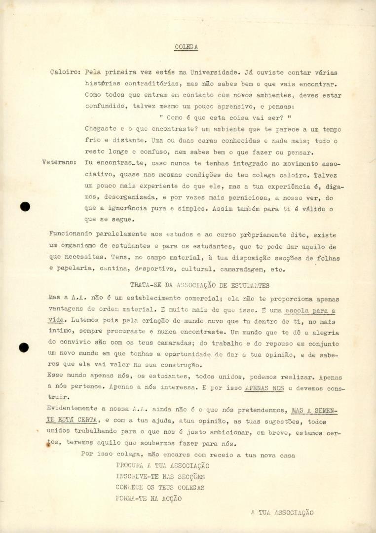 Circular de Associação de Estudantes não identificada dirigida aos caloiros e aos veteranos da universidade, sobre o papel da associação.