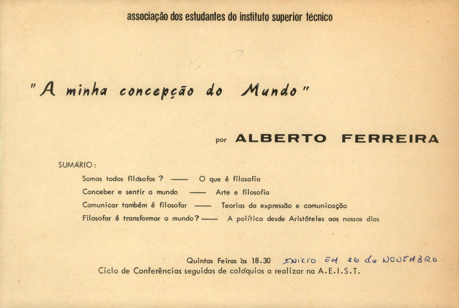 Panfleto da Associação dos Estudantes do Instituto Superior Técnico - "A minha concepção do Mundo" por Alberto Ferreira. Ciclo de Conferências seguidas de colóquios a realizar na A.E.I.S.T. - Associação dos Estudantes do Instituto Superior Técnico.