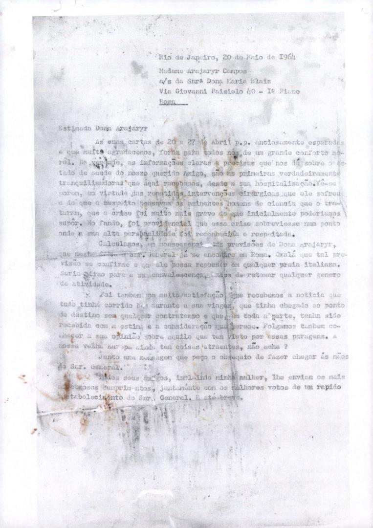 Conteúdo e Estrutura | Âmbito e Cont.: Carta datilografada redigida pelo Coronel Oliveira Pio dirigida a Arajaryr Campos, em resposta às cartas de 20 e 27 de Abril de 1964, respeitantes à saúde do general Humberto Delgado.