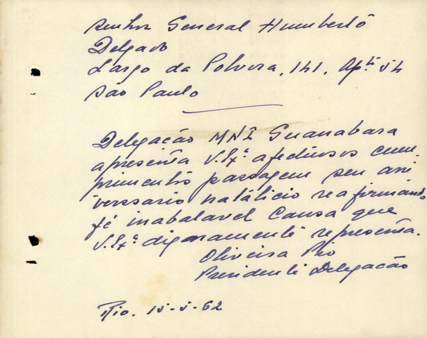 Conteúdo e Estrutura | Âmbito e Cont.: Carta manuscrita na qual o Coronel Francisco de Oliveira Pio em nome pessoal e dos restantes membros da Delegação de Guanabara do Movimento Nacional Independente (MNI) apresenta felicitações pelo aniversário do General Humberto Delgado.