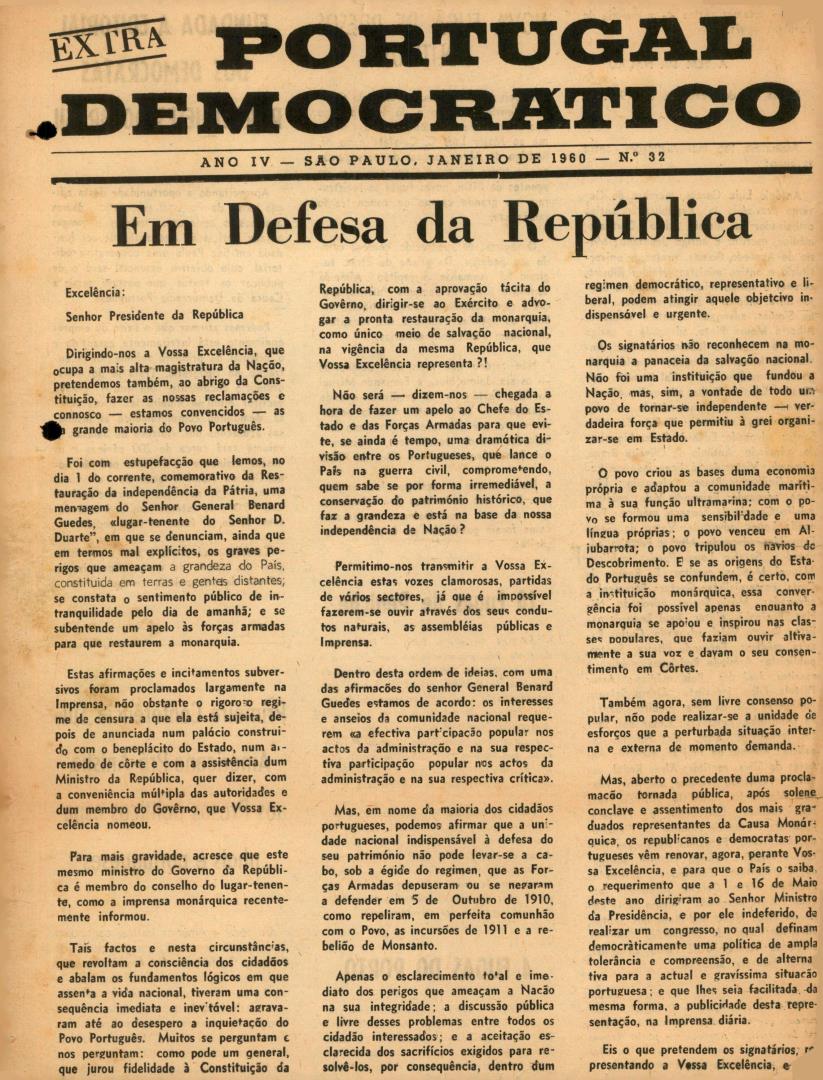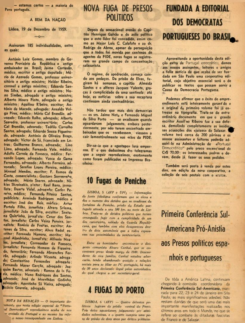 Conteúdo e Estrutura | Âmbito e Cont.: Jornal ?Portugal Democrático: Extra?, Ano VI, N.º32, com os seguintes artigos:" Em Defesa da República"; "nova Fuga De Presos Políticos": Transcrição de carta datada de 19 de Dezembro de 1959, assinada por 185 individualidades portuguesas, dirigida ao Presidente da República, defendendo a República face à mensagem do senhor general Benard Guedes, lida no dia 1 de Dezembro, fazendo um apelo às Forças Armadas para a restauração da monarquia em Portugal. / "Nova Fuga De Presos Políticos": Artigo sobre a fuga de Jaime Neto e Fernando Miguel da Silva Porto da prisão tendo sido resgatados pela PIDE / "10 Fugas de Peniche": Artigo sobre a fuga de dez presos políticos da fortaleza de Peniche, incluindo Álvaro Cunhal e o guarda prisional /"4 Fugas Do Porto": Artigo sobre a fuga de quatro presos políticos da prisão do Porto. / "Fundada A Editorial Dos Democratas Portugueses Do Brasil": Artigo sobre a fundação em São Paulo de editorial democrática, e a entrega a tipografia do documento de Aquilino Ribeiro demolindo acusações dos "juízes" de Salazar./ "Primeira Conferência Sul-Americana Pró-Anista aos Presos políticos espanhois e portugueses": Artigo anunciando as muitas adesões por parte dos países da América Latina à primeira Conferência Sul-America Pró-Amnistia aos Presos Políticos espanhois e portugueses.