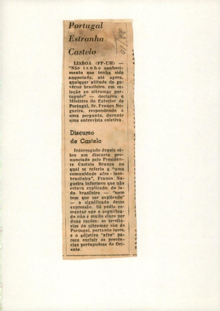 Artigo publicado no jornal "Última Hora" que expõe a incompreensão por parte do Ministro Franco Nogueira da expressão utilizada pelo Presidente da República do Brasil, Castelo Branco de "comunidade afro-luso-brasileira".