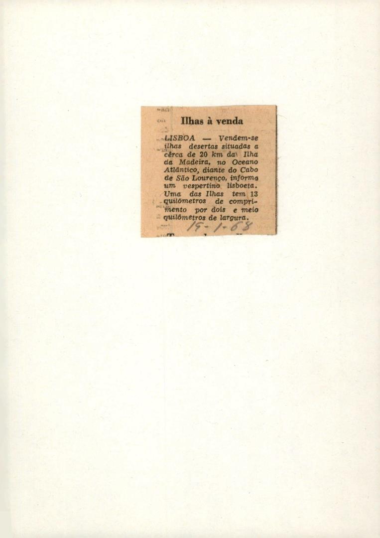 Artigo de jornal não identificado com fonte em Lisboa no qual se informa que se encontram à venda ilhas desertas situadas a 20 km da Madeira.