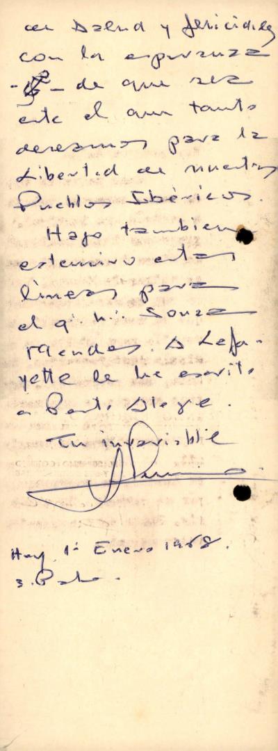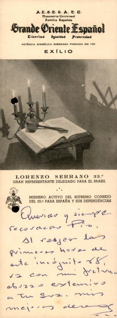Panfleto do Grande Oriente Espanhol com dedicatória manuscrita de Lorenzo Serrano dirigida ao Coronel Francisco de Oliveira Pio no início do ano de 1968.