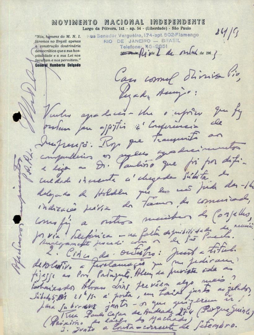 Nº 861/63 [Carta dirigida ao coronel Francisco de Oliveira Pio (Rio de Janeiro)]