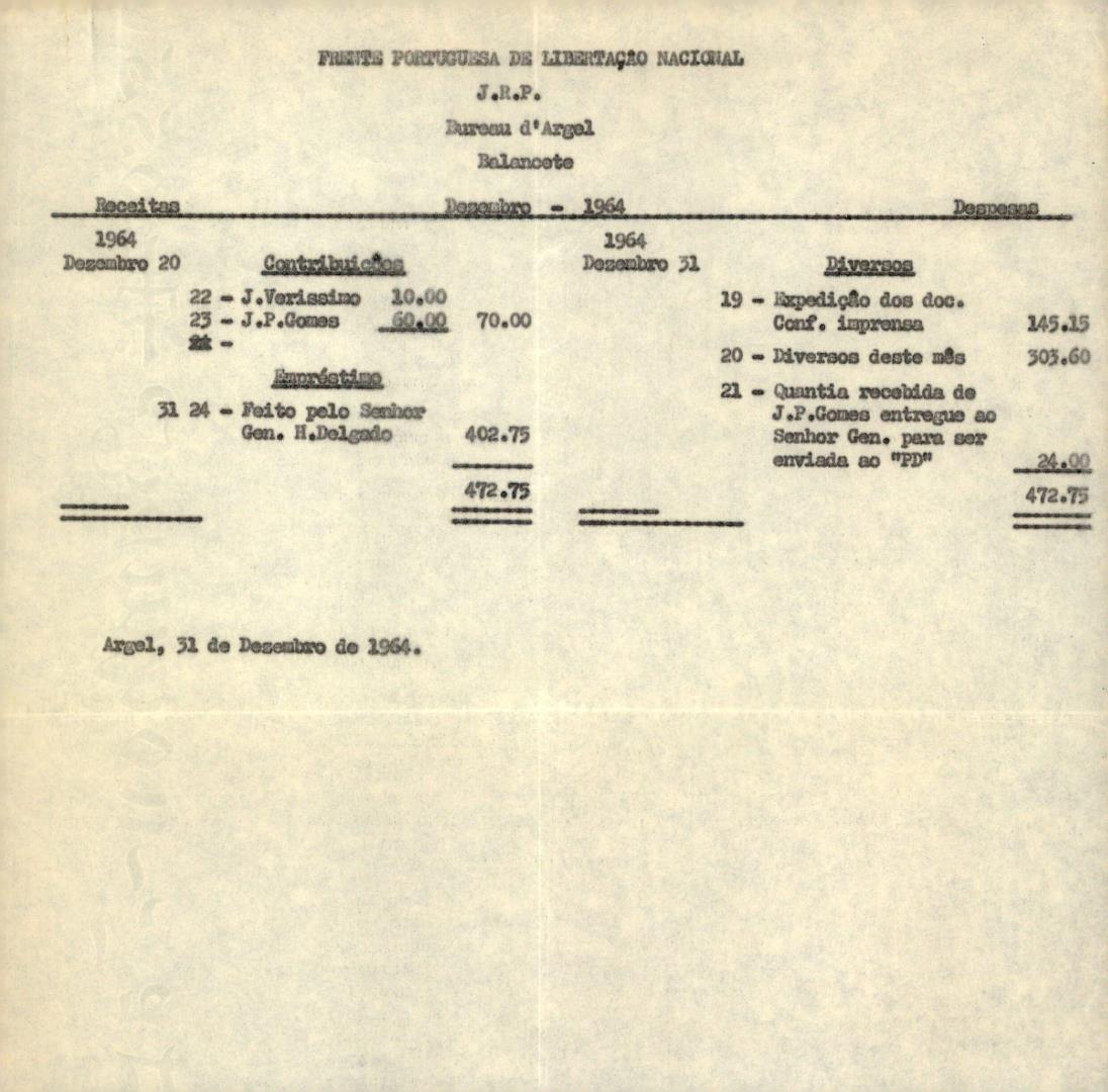 Frente Portuguesa de Libertação Nacional, Junta Revolucionária Portuguesa. Balancete de Dezembro – 1964