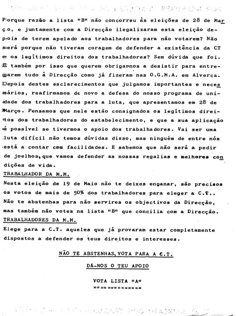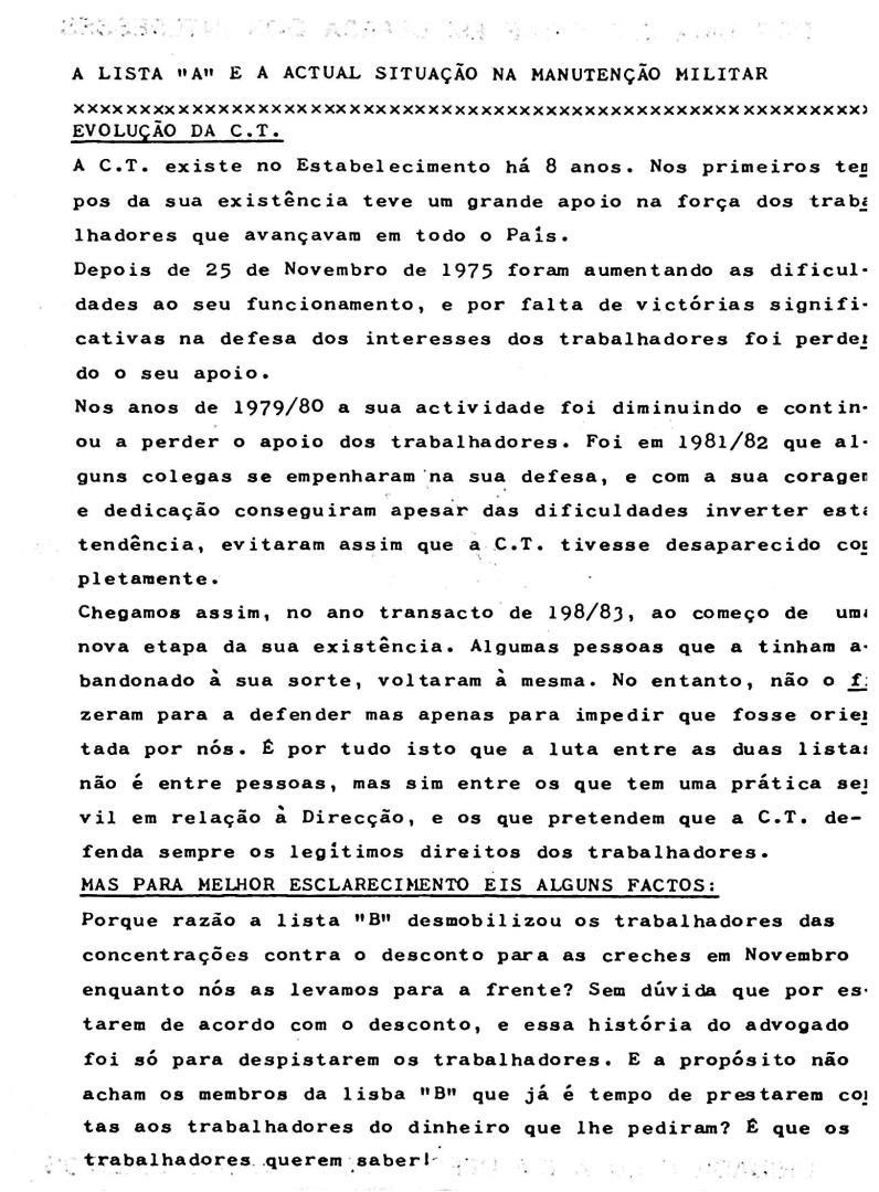 Conteúdo e Estrutura | Âmbito e Cont.: Brochura da Lista A para a Comissão de Trabalhadores da Manutenção Militar.