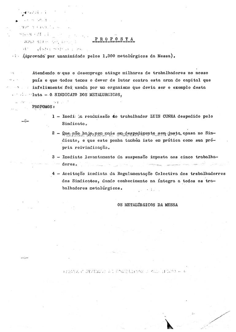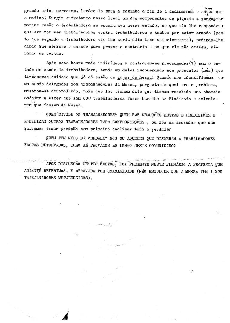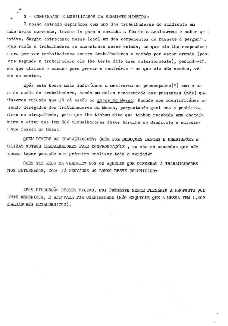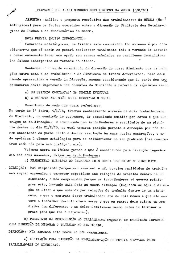 Comunicado com análise e proposta resolutiva dos trabalhadores da Messa (Metalúrgicos) para os factos ocorridos entre a direção do Sindicato dos Metalúrgicos de Lisboa e os funcionários do mesmo. A proposta presente no plenário foi aprovada por unanimidade pelos 1300 metalúrgicos da Messa.