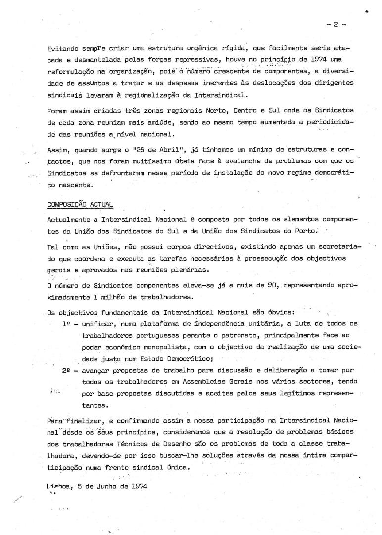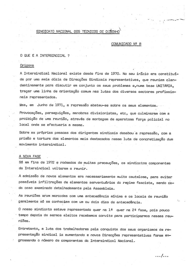Comunicado N.º 8 do Sindicato Nacional dos Técnicos de Desenho acerca das origens e composição da Intersindical Nacional.