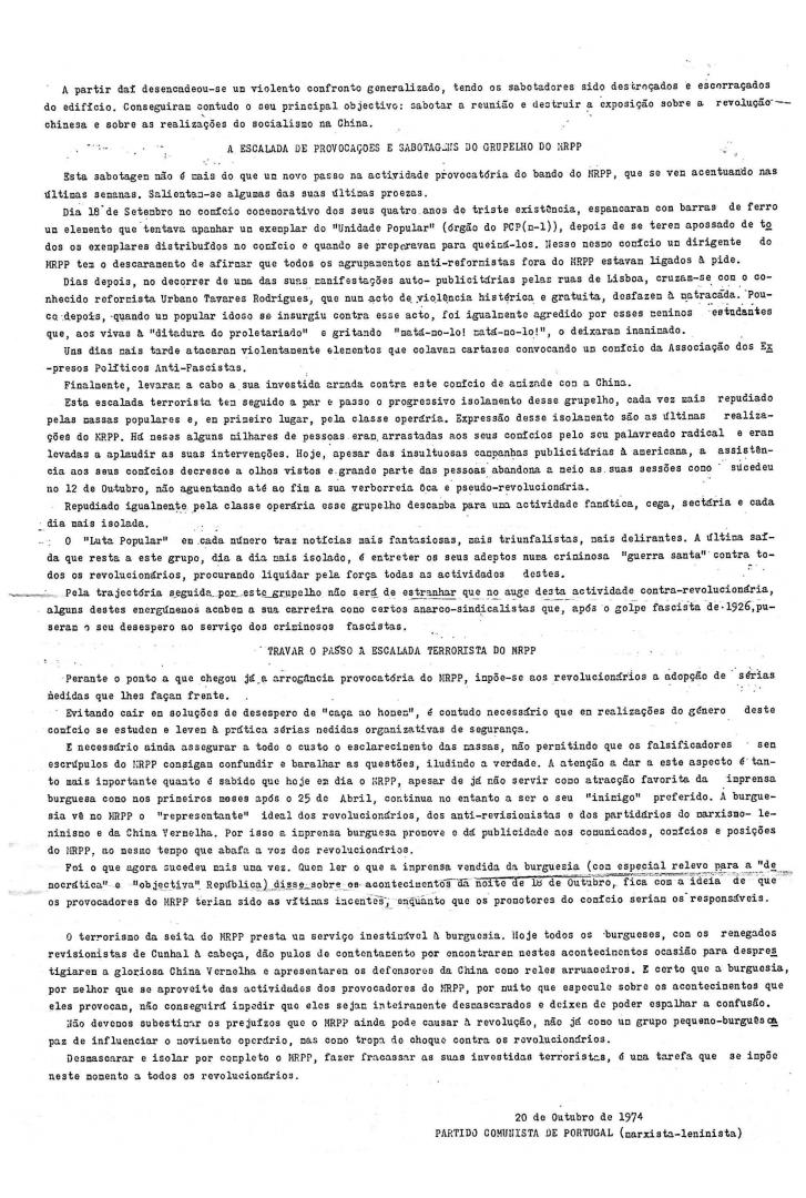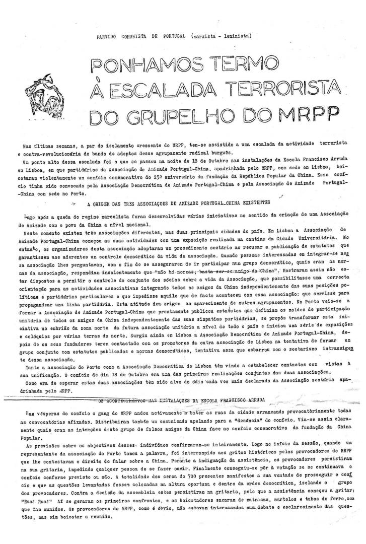 Comunicado do Partido Comunista de Portugal (Marxista-Leninista) acerca de como travar a escalada terrorista do MRPP.