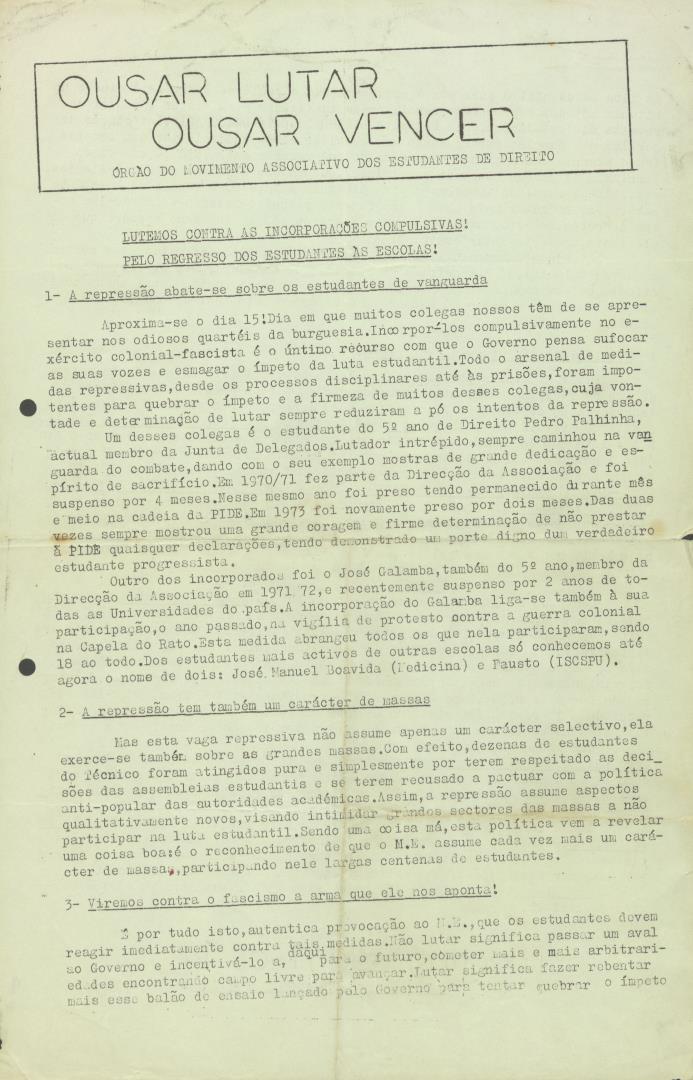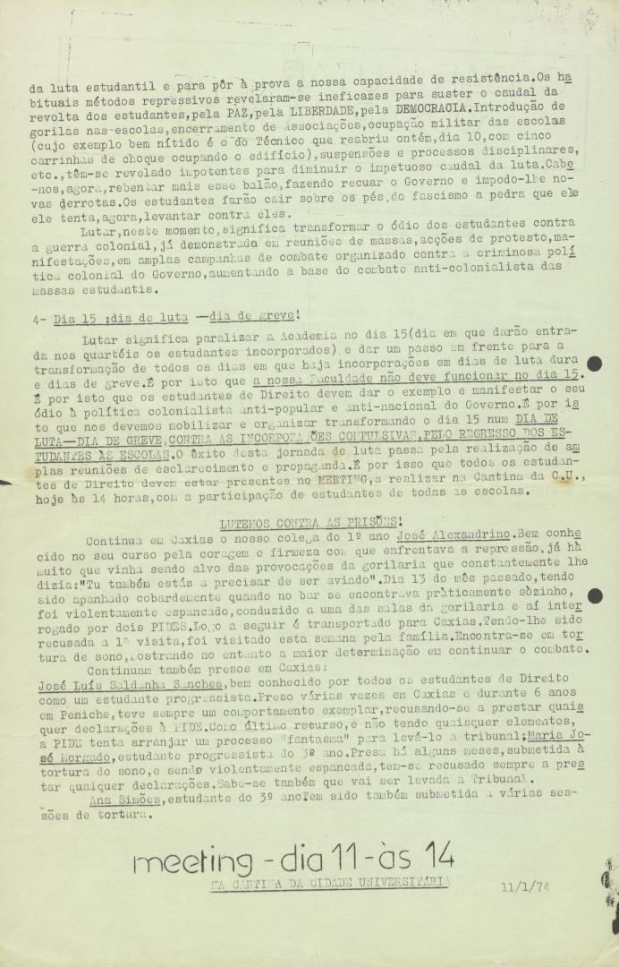 Comunicado do "Ousar Lutar, Ousar Vencer" - Órgão do Movimento Associativo dos Estudantes de Direito de Lisboa para meeting dia 11 às 14 horas na cantina da Cidade Universitária.