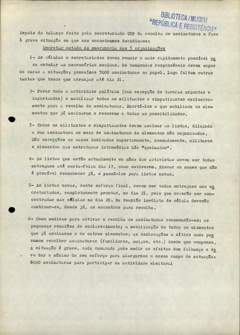 Conteúdo e Estrutura | Âmbito e Cont.: Documento sobre o balanço feito pelo secretariado UDP da recolha de assinaturas e face à grave situação em que nos encontramos decidiu-se decretar estado de emergência nas 3 organizações.