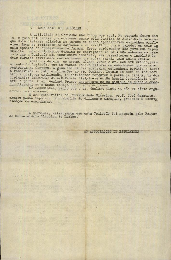 Comunicado das Associações de Estudantes no qual o Reitor da Universidade Clássica de Lisboa constituiu uma Comissão Administrativa da Associação de Estudantes da Faculdade de Ciências de Lisboa.