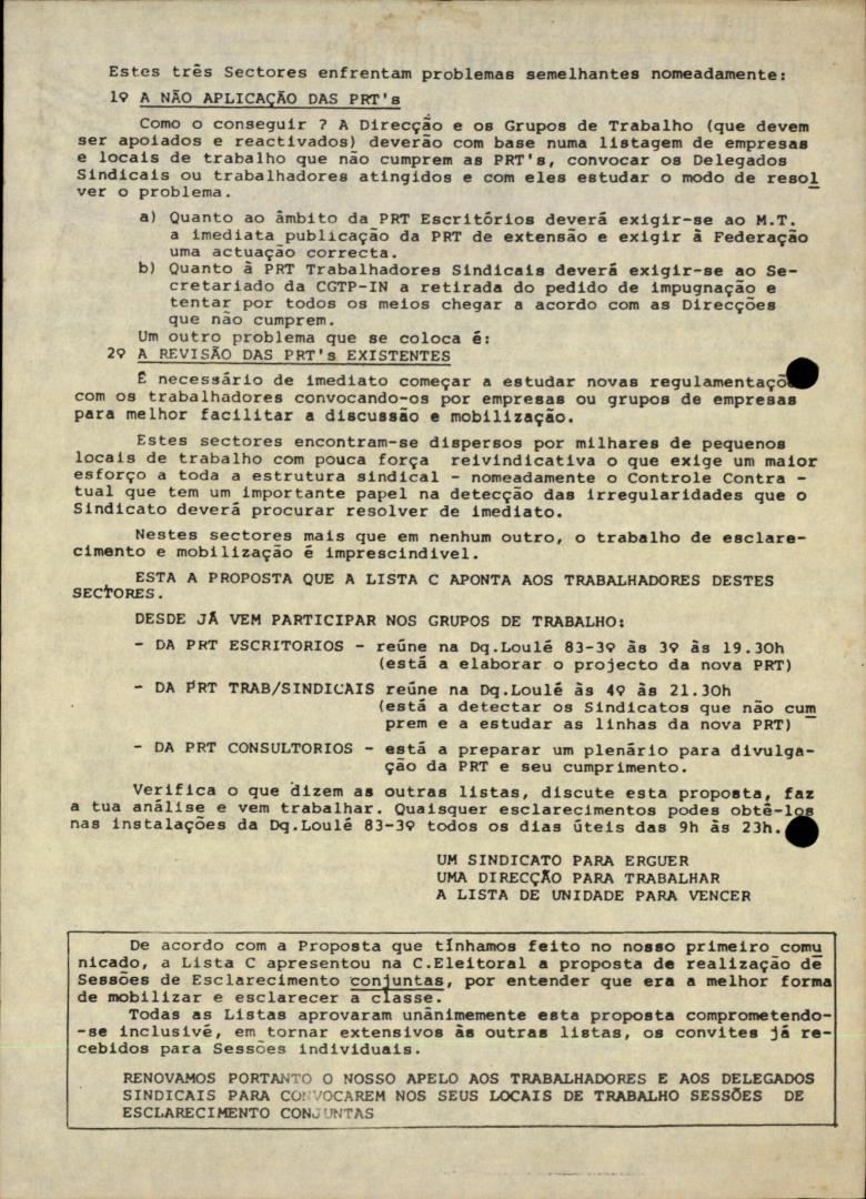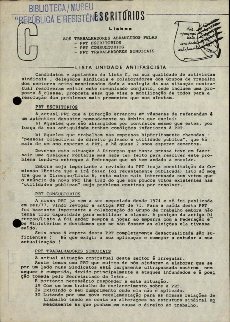 Escritórios Lisboa. Aos Trabalhadores Abrangidos pelas PRT Escritórios, PRT Consultórios, PRT Trabalhadores Sindicais. Lista C - Lista Unidade Antifascista