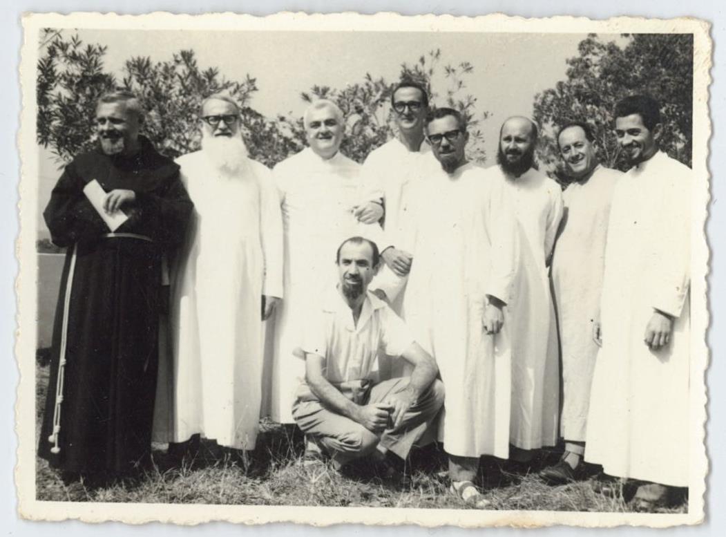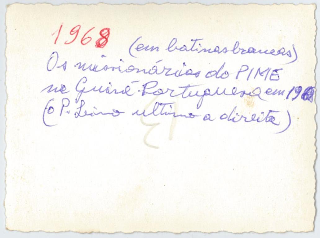 Fotografia a preto e branco com a seguinte legenda: 1968 (em batinas brancas) Os missionários do PIME na Guiné Portuguesa em 1968 (o Padre Lino último à direita).