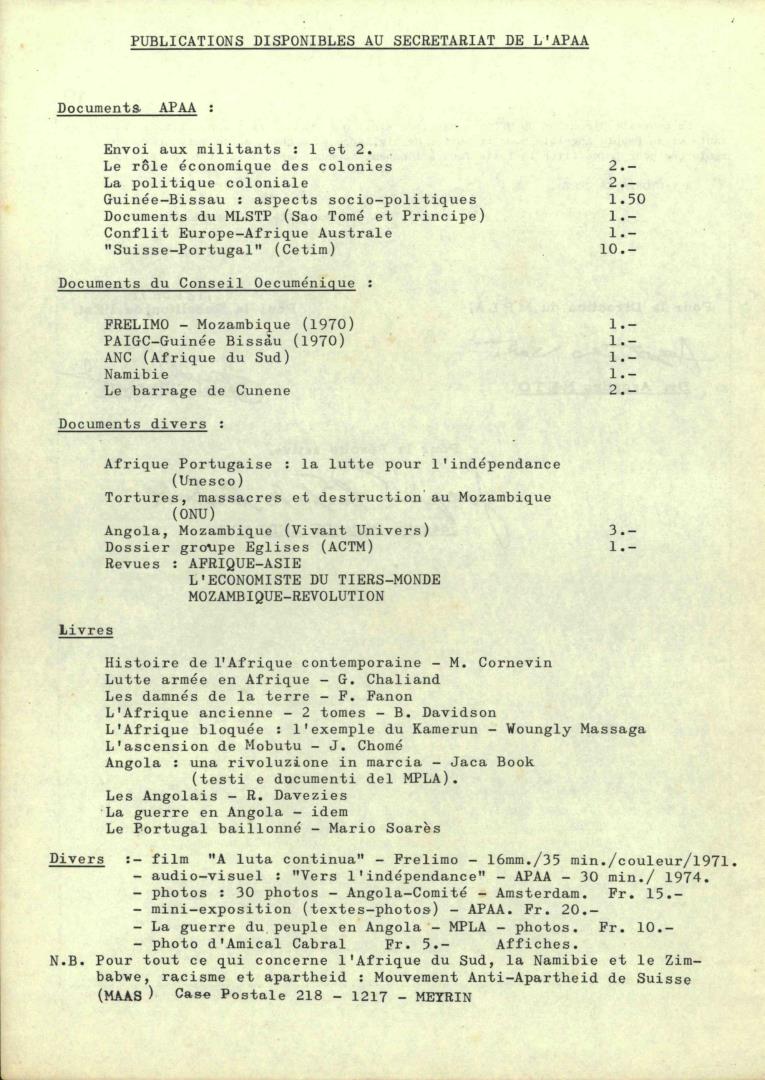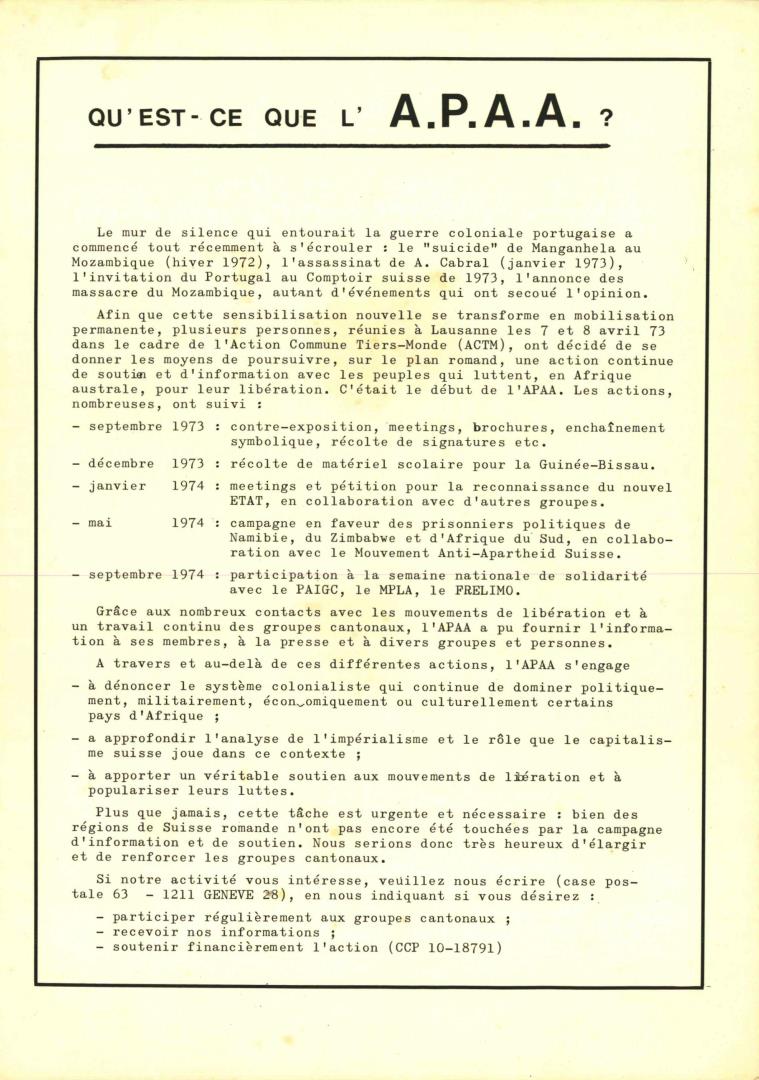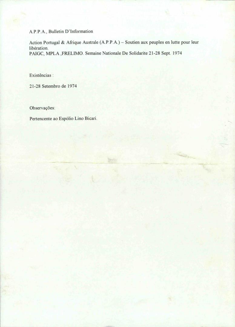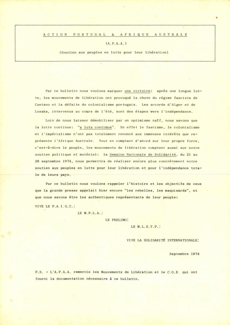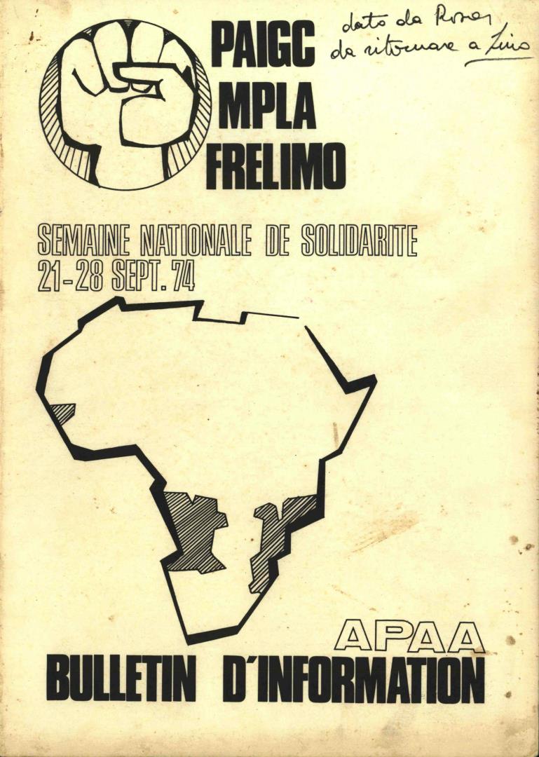 APAA - Action Portugal & Afrique Australe, Bulletin D'Information. PAIGC, MPLA, FRELIMO. Semaine Nationale de Solidarite, 21-28 Sept. 1974