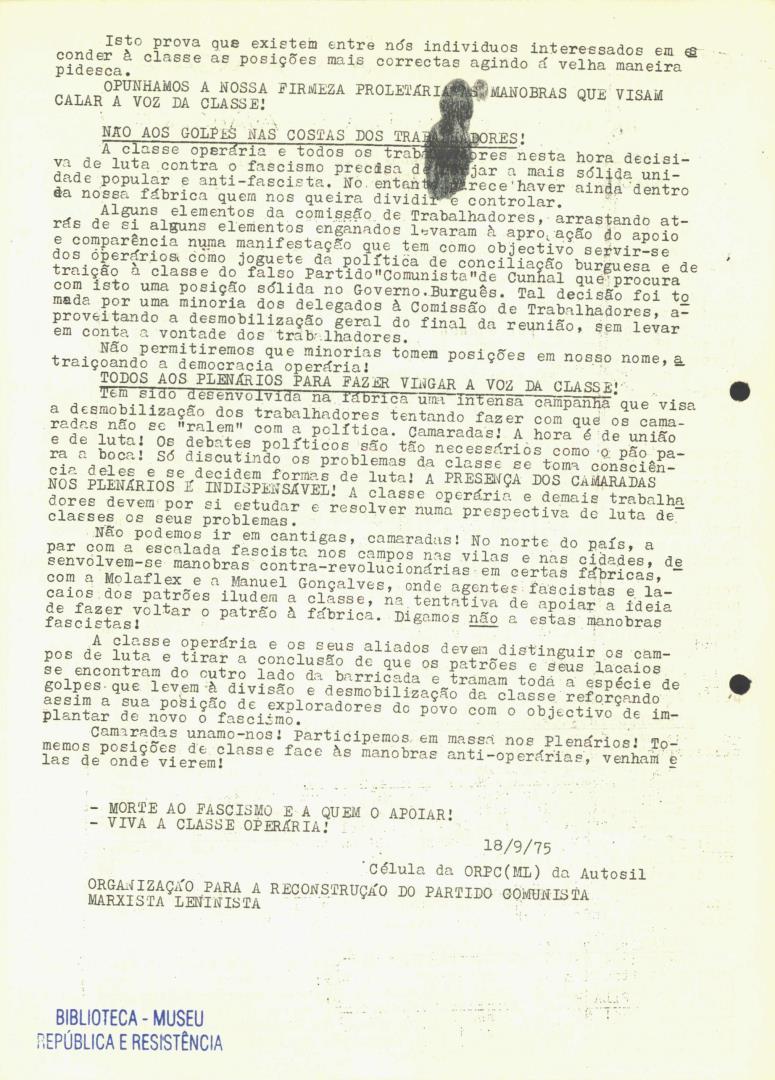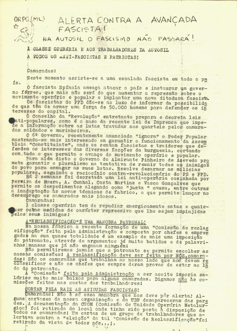 Conteúdo e Estrutura | Âmbito e Cont.: Comunicado da Organização para a Reconstrução do Partido Comunista (Marxista-Leninista) da Autosil.