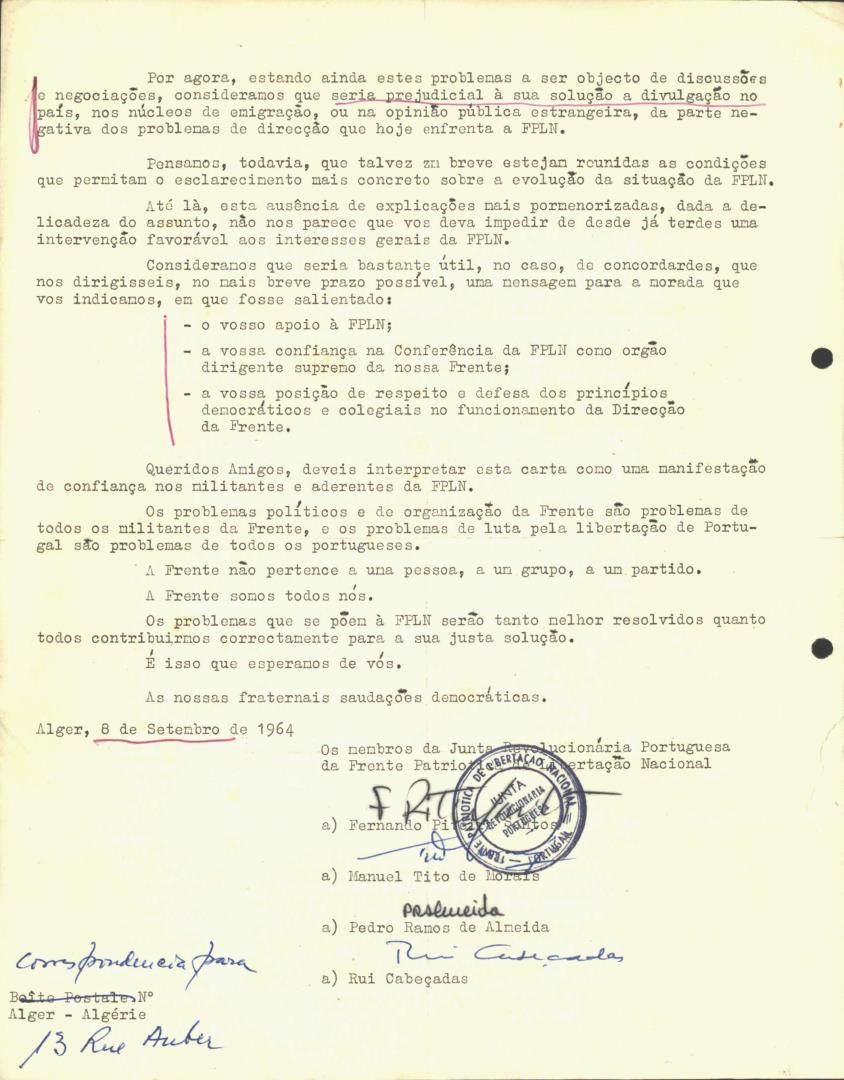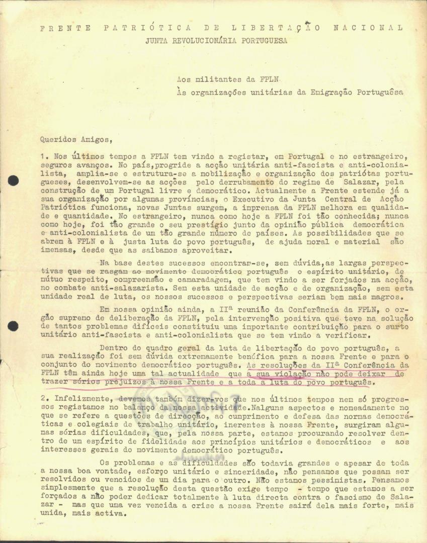 Carta da Frente Patriótica de Libertação Nacional, Junta Revolucionária Portuguesa, dirigida aos militantes da FPLN, às organizações unitárias da Emigração Portuguesa acerca dos problemas de luta pela libertação de Portugal.