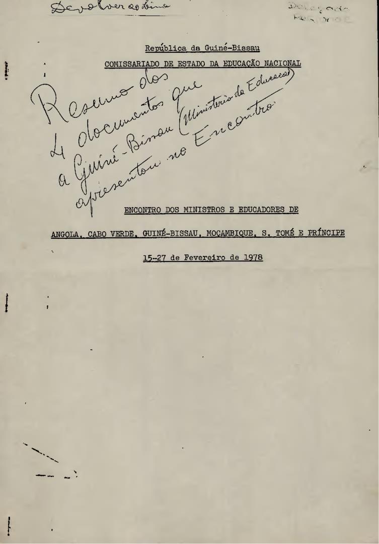 Documento da responsabilidade do Comissariado de Estado da Educação Nacional da República da Guiné-Bissau que contém resumo dos documentos apresentados no Encontro dos Ministros da Educação e Educadores de Angola, Moçambique, Guiné-Bissau, Cabo Verde, São Tomé e Príncipe, realizado de 15 a 27 de fevereiro de 1978.