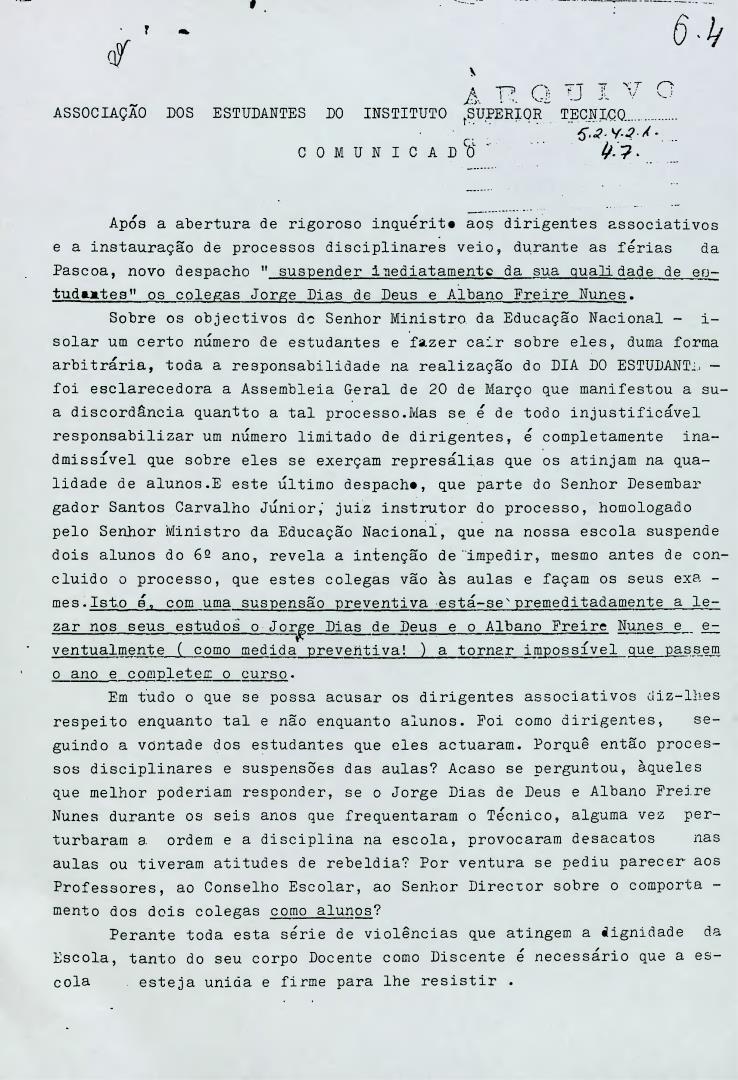 Cópia de comunicado da Associação dos Estudantes do Instituto Superior Técnico onde se trata da suspensão dos estudantes Jorge Dias de Deus e Albano Freire Nunes.