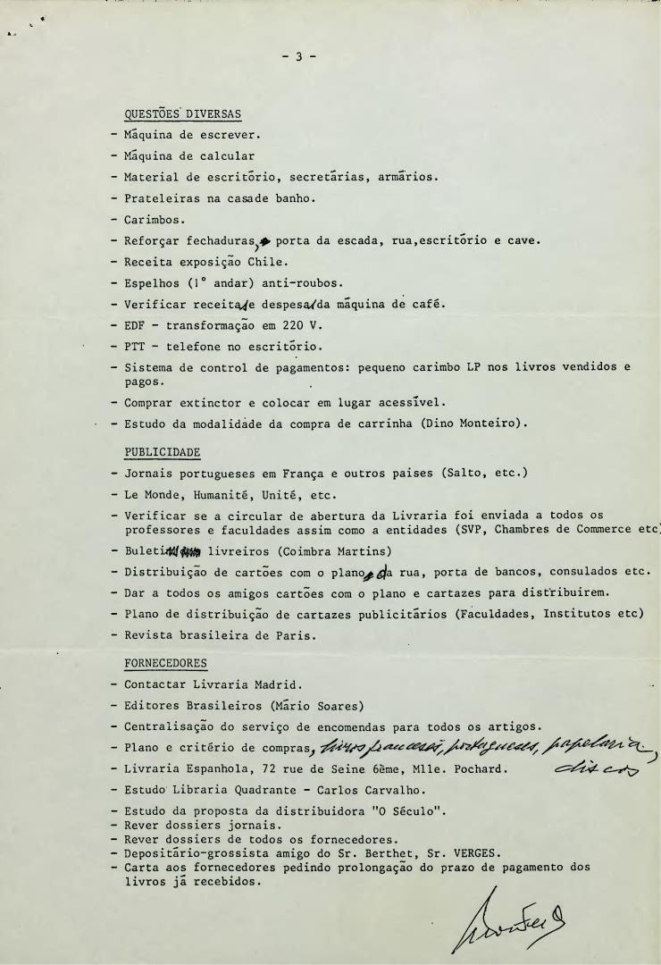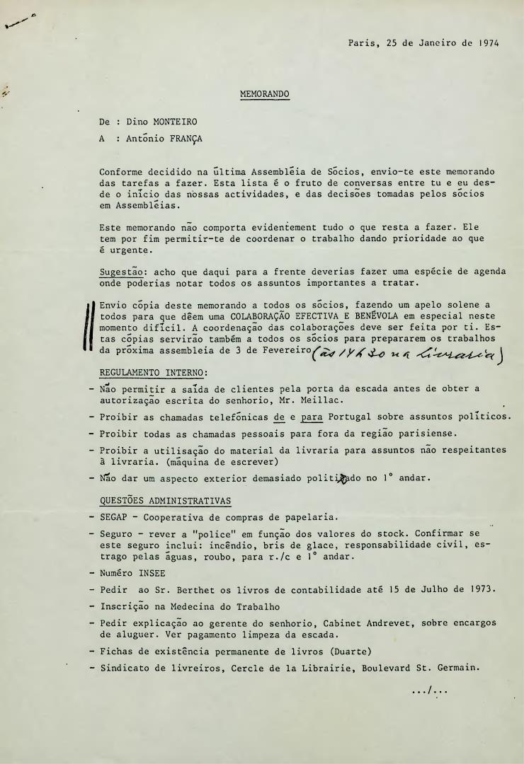 Memorando datilografado remetido por Dino Monteiro a António França, no qual lhe dá conta das tarefas que há a fazer relativas à Librairie Portugaise.