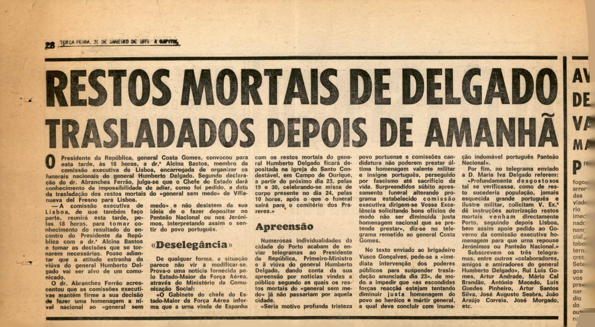 Recorte do jornal "A Capital", de 21 de Janeiro de 1975 com artigo intitulado: "Restos mortais de Delgado trasladados depois de amanhã".